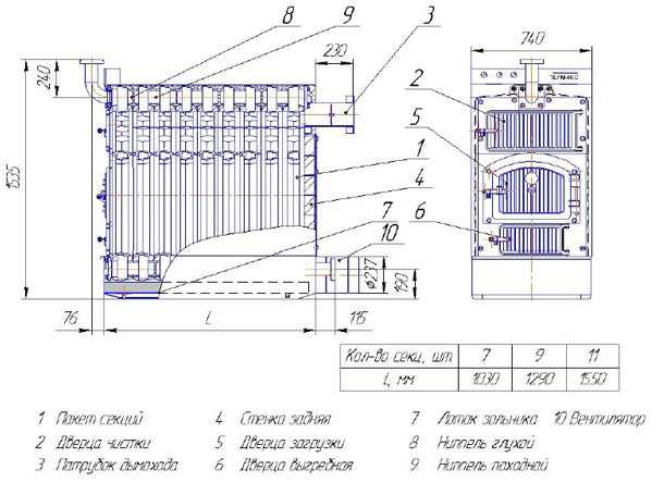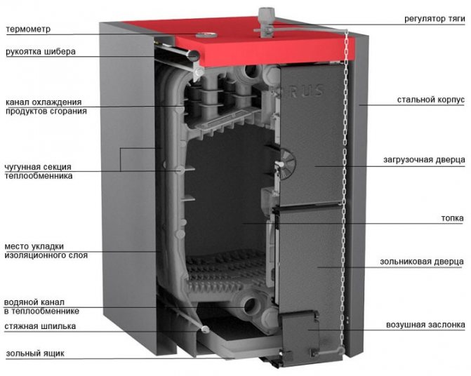 Chaudière au design classique, la fonte à combustible solide est un mécanisme complexe dans lequel chaque élément a sa propre fonction et remplit certaines fonctions. La résistance structurelle élevée, la fiabilité des connexions des éléments structurels individuels garantissent un fonctionnement sûr de l'unité.