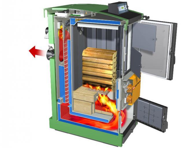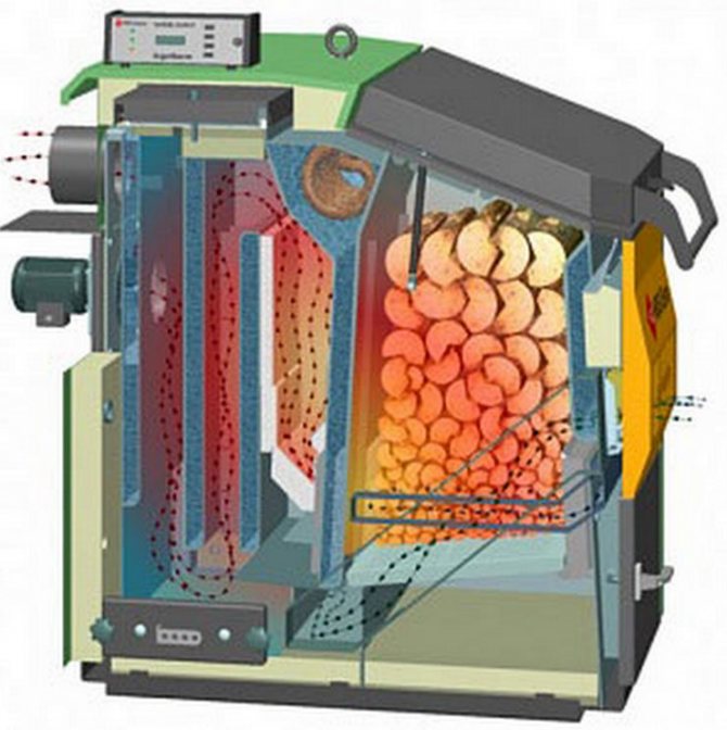 Important! Les matières premières de ces équipements brûlent lentement et complètement, ce qui explique le rendement élevé de l'appareil par rapport aux autres modèles de chaudières à combustible solide.