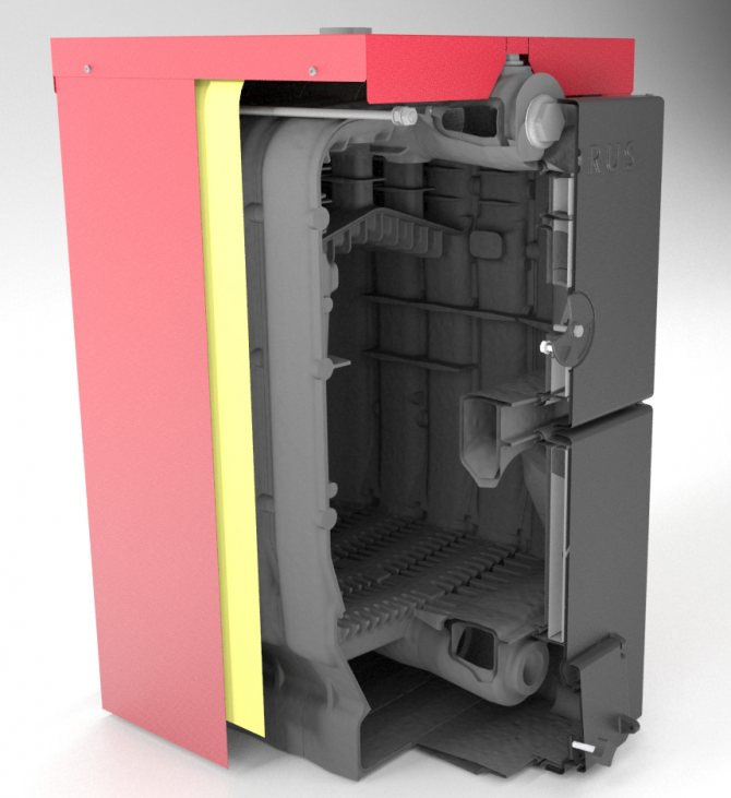 Une chaudière de chauffage à combustible solide en fonte avec un circuit d'eau est une structure sectionnelle gainée de panneaux de revêtement. Entre le corps et le matériau de revêtement, il y a une couche (jusqu'à 100 mm) de feuille isolante résistante à la chaleur. Le plus souvent, il s'agit de nattes en laine de basalte résistantes au feu.