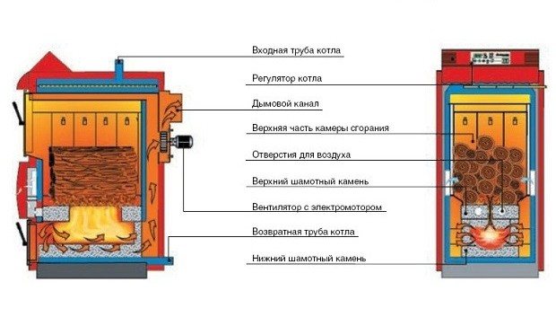 Le principe d'une chaudière génératrice de gaz à combustible solide est le suivant: il y a deux chambres dans son corps, l'une d'elles est remplie de combustible, lors de la combustion duquel du gaz est libéré, qui brûle également, mais déjà dans une autre chambre. Ces chaudières présentent de nombreux avantages: