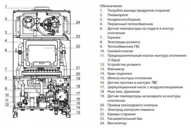 Les chaudières italiennes peuvent fonctionner sans à-coups même à une pression de 5 mbar et à une température de moins 52 ° C. Ils sont équipés de deux filtres mécaniques qui purifient l'eau. Les développeurs ont pris en compte la quasi-totalité des dangers des équipements à gaz dans des conditions à haut risque.