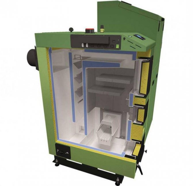 Il y a deux chambres à l'intérieur des chaudières à pyrolyse. Le combustible solide est mis en un, les produits de sa combustion vont dans la deuxième chambre et s'y mélangent avec l'oxygène fourni avec la poussée. Le résultat est un mélange qui est brûlé au deuxième tour. Dans ce cas, une chaleur supplémentaire est libérée, par conséquent, l'efficacité de l'installation augmente considérablement.Les serpentins des échangeurs de chaleur dans une telle chaudière sont situés strictement horizontalement au-dessus des chambres de combustion.