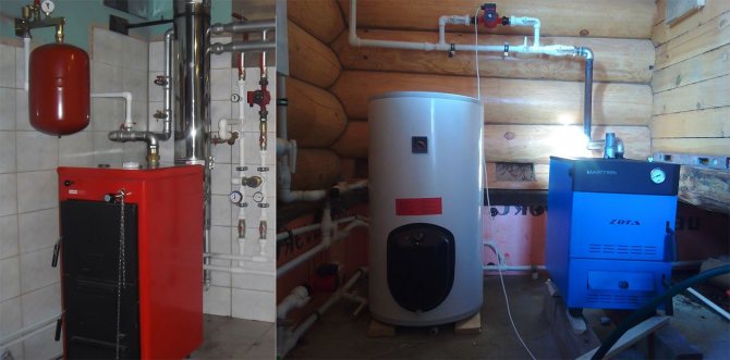 Sur la gauche se trouve une chaudière à combustible solide à double circuit. Sur la droite, un circuit simple avec une chaudière à chauffage indirect. Dans le premier cas, des économies significatives non seulement sur l'équipement, mais aussi sur le cerclage, des économies de place importantes.