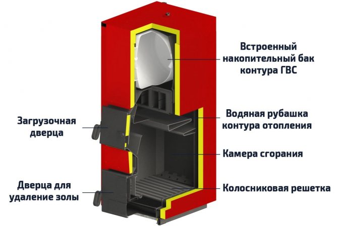Fondamentalement, les modèles à deux circuits diffèrent peu des chaudières classiques à un seul circuit à combustible solide. La seule différence est la présence d'un circuit ECS supplémentaire, dans lequel l'eau sanitaire ne se mélange pas avec l'eau technique dans le circuit de chauffage. Le deuxième circuit peut être organisé de différentes manières, auparavant la chemise d'eau était simplement divisée en deux parties.