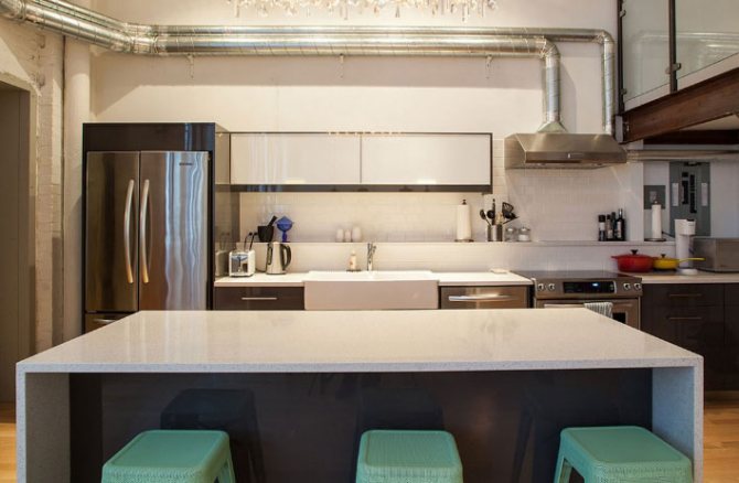 - après avoir peint pour correspondre à la décoration murale. Dans ce cas, il fusionnera simplement visuellement avec les murs et deviendra invisible. En tant que l'une des options pour cacher le tuyau et le présenter efficacement à l'intérieur, les concepteurs recommandent de peindre sa surface dans des tons inhabituels. Par exemple, la peinture dorée, si la cuisine est décorée dans des couleurs chaudes ou argentées, si son design est fait dans des couleurs froides;