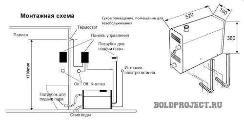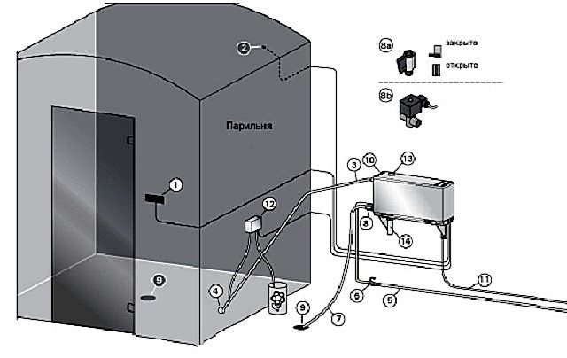 Pour commencer, il convient de donner une version classique de l'installation d'un générateur de vapeur pour un bain. Sur ce schéma, vous pouvez clairement voir comment toutes les communications nécessaires au fonctionnement complet de l'appareil doivent être séparées.