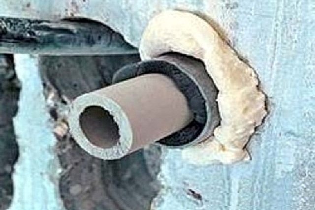 - Une fois que l'emplacement de l'appareil sur le mur ou sur le sol est définitivement clair, la section du tuyau à travers le mur est déterminée. Ensuite, un trou traversant est fait (par exemple, avec un foret), qui est 10 ÷ 12 mm plus grand que le diamètre du tuyau. Un morceau de tuyau est installé dans le trou - un manchon, d'un diamètre de 3 5 mm plus grand que le tuyau de vapeur. Cette doublure créera le renfort nécessaire au passage de la conduite de vapeur principale. Vous pouvez fixer cette pièce-manchon dans le trou percé dans le mur à l'aide de mousse de polyuréthane ou de mortier de ciment.