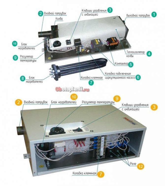 - Éléments chauffants - fonctionnent sur le principe d'une bouilloire électrique. Le liquide de refroidissement (eau ou antigel) qui traverse le réservoir est chauffé par l'élément chauffant à l'intérieur. Le liquide de refroidissement chauffé passe par les tuyaux vers les radiateurs de chauffage, qui donnent la chaleur reçue à la pièce, chauffant l'air.