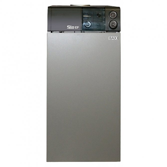 Version au sol à double circuit de la marque Baksi. Diffère par un design élégant - corps gris et panneau de commande noir. Le brûleur est atmosphérique. Le dispositif de chauffage a un thermocouple à haute sensibilité, qui arrête rapidement l'alimentation en gaz lorsque la flamme est éteinte. Ils sont connectés à des systèmes avec circulation naturelle du liquide de refroidissement. Leur puissance maximale est de 61 kW. Prix estimé - 45 000 roubles. Par exemple - BAXI SLIM EF 1.22: