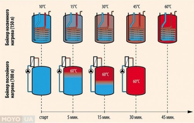 Deux buses pénètrent à l'intérieur du réservoir: à travers l'une d'elles, de l'eau froide est fournie à la chaudière, et à travers l'autre, elle (déjà chaude) est fournie à un consommateur externe.