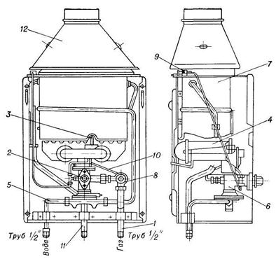 | Figure. 12.4. Appareil de chauffage de l'eau à circulation au gaz domestique, type VPG: 1 – gazoduc; 2 – soupape de blocage de gaz; 3 – brûleur pilote; 4 – brûleur principal; 5 – arrivée d'eau; 6 – té de brûleur; 7– échangeur de chaleur; 8 – dispositif de sécurité de traction; 9 – capteur de poussée; 10 – thermocouple; 11 – sortie d'eau chaude; 12 – sortie des gaz résiduaires |