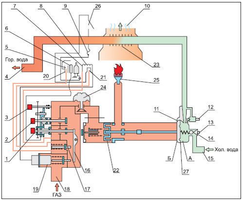 Une diminution de la pression dans le système d'approvisionnement en eau de la ville se produit principalement chez les consommateurs vivant aux étages supérieurs des immeubles de grande hauteur pendant les heures de prise d'eau maximale. Pour une maison de campagne, il y a des raisons possibles: une diminution du débit (productivité) d'un puits, un dysfonctionnement d'une station d'alimentation en eau. Pour éviter un accident, l'appareil dispose d'un dispositif appelé «unité d'eau». L'appareil fonctionne comme suit. Lorsque l'eau est coupée, la pression dans les cavités A et B est égalisée. La membrane 27 se déplace vers la droite et la vanne 22 coupe l'alimentation en gaz du brûleur principal. La colonne passe en mode veille.