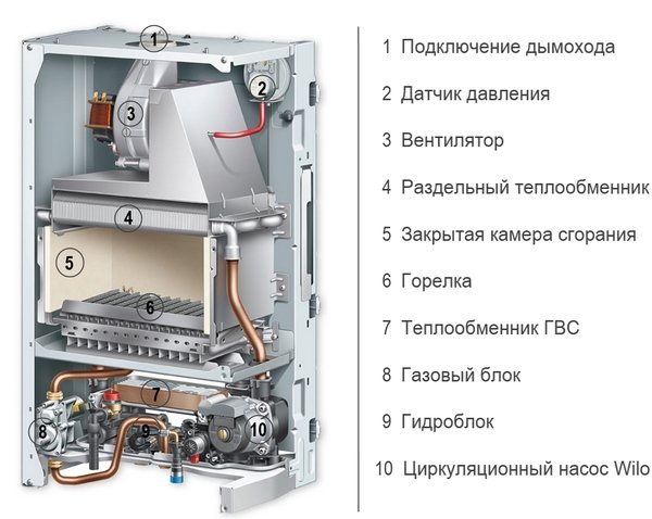 - Échangeur de chaleur. De type tubulaire, les buses sont connectées au système de chauffage. Le liquide de refroidissement y est chauffé. S'il y a une alimentation en eau chaude, il est nécessaire de prendre en compte que lorsque le mode chauffe-eau est activé, le système de chauffage cesse de fonctionner.