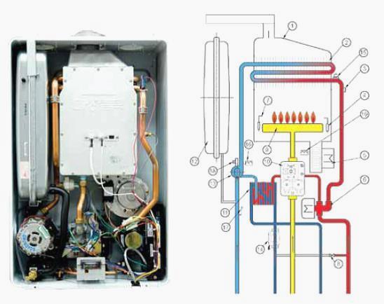 1. Collecteur de gaz résiduaires, 2. Échangeur de chaleur primaire, 3. Capteur de température, 4. Capteur d'ionisation, 5. Ventilateur, 6. Vanne à trois voies, 7. Électrode d'allumage, 8. Dispositif d'appoint, 9. Brûleur à gaz, 10. Vanne gaz, 11. Echangeur à plaques, 12. Vase d'expansion, 13. Pompe de circulation, 14. Sonde de débit d'eau sanitaire, 15. Thermostat de surchauffe, 16. Sonde de pression caloporteur, 17. Soupape de surpression, 18. Air automatique soupape de purge, 19. Capteur de pression d'air ...