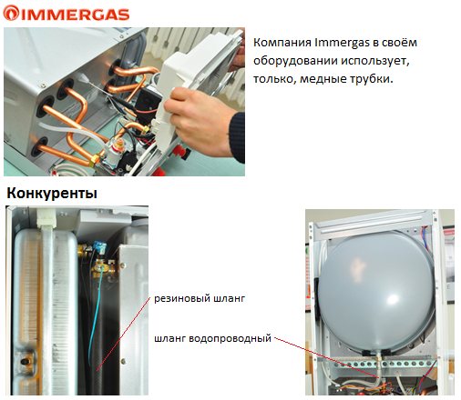 De nombreux composants importants de la chaudière ne sont fabriqués que dans une usine italienne. Ces composants comprennent: une chaudière à eau, qui contient un échangeur de chaleur en spirale original en acier inoxydable de haute qualité, ainsi qu'une canalisation de chaudière (une instruction est également jointe). Mais ne vous inquiétez pas, ces pièces seront difficiles à acheter, car les centres de service Immergas sont situés dans toute l'Europe, y compris en Russie.