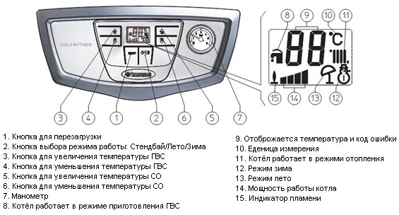 La chaudière est contrôlée et surveillée à l'aide d'un «panneau de commande» avec un affichage numérique et des boutons de commande. Cela vous permet de contrôler et d'ajuster clairement le mode de fonctionnement de la chaudière. L'avantage du panneau de commande de la chaudière EOLO Star 14 R est que chaque bouton est responsable de sa propre action - pas besoin de monter dans le menu de la chaudière et d'appuyer sur plusieurs boutons pour régler la chaudière ou changer la température. Les chaudières à 4 ou 5 boutons sont très peu pratiques à contrôler et à configurer - pour régler le paramètre souhaité, vous devrez effectuer quelques opérations supplémentaires dans le menu de la chaudière.