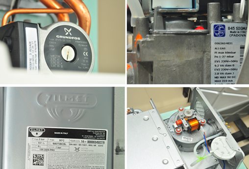 Pompe de circulation (trois vitesses - Grundfos (Danemark); Vase d'expansion - Zilmet (Italie); Ventilateur - Fime (Italie); Unité modulée au gaz - Sit (Italie); Échangeur de chaleur - Giannoni (Italie); Tableau de commande et de régulation - Bertelli & Partners (Italie).