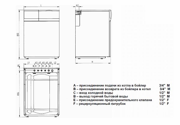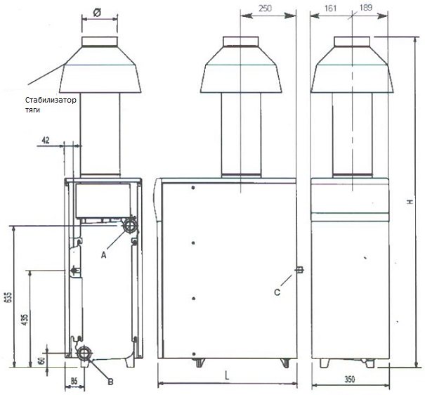 Le diamètre de la cheminée pour les modèles atmosphériques est de 110 à 180 mm, le raccordement du gaz à la chaudière se fait avec un tuyau de gaz à soufflet avec un diamètre de filetage de 1/2' ou 3/4'. Le diamètre du filetage intérieur des raccords du circuit de chauffage est de 1 1/4 ', et sur les modèles avec pompe et réservoir intégrés: "retour - 1 1/4", "droit" - 3/4'.