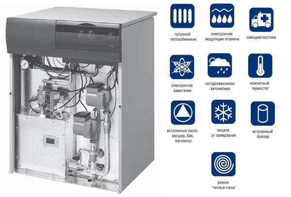 - échangeur de chaleur en fonte ; - brûleur à gaz en acier inoxydable; - la possibilité de connecter une chaudière et un thermostat d'ambiance ; - qualité des matériaux et de la fabrication; - la présence d'un stabilisateur de traction (dans les modèles d'une puissance de 40 kW); - format compact.