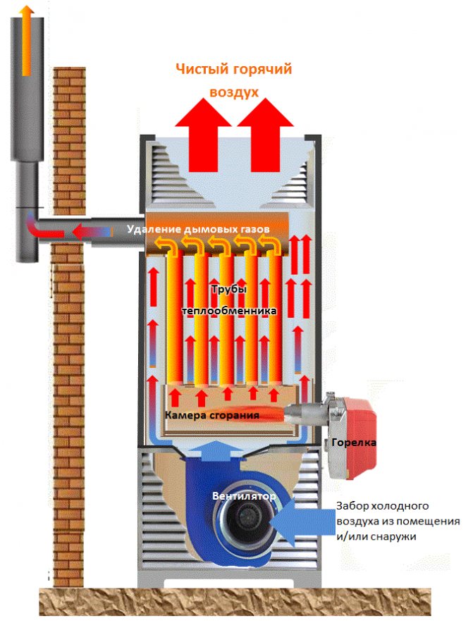 En règle générale, le générateur de chaleur est équipé d'un brûleur, d'une chambre de combustion et d'un échangeur de chaleur. Lorsque le carburant brûle, l'échangeur de chaleur se réchauffe et transfère la chaleur à l'air qui le traverse. Les flux chauffés pénètrent dans les conduits d'air et sont dirigés dans la pièce. Les produits de combustion partent par la cheminée. L'image ci-dessous montre un diagramme du chauffage de l'air.
