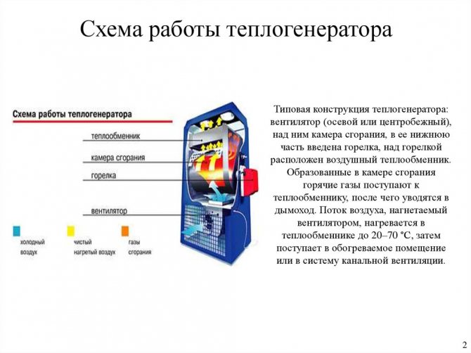 Chauffage au gaz - chauffer tout le volume de la pièce à l'aide d'un flux de convection d'air chaud ou chaud. Ce processus nécessite un appareil spécial - un aérotherme (générateur de chaleur).