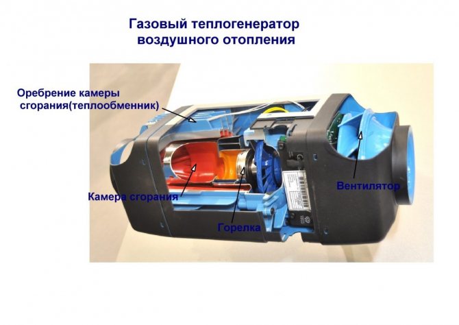 Un générateur de chaleur à gaz standard pour le fonctionnement du chauffage de l'air se compose de plusieurs pièces qui interagissent les unes avec les autres: