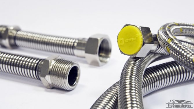 Le prix d'un tuyau en acier inoxydable à soufflet pour l'eau est supérieur au coût des produits pour les équipements à gaz, ce qui se justifie par leur fiabilité. En soi, le soufflet se présente sous la forme d'un tuyau ondulé avec des mamelons de fixation aux extrémités. Connectez la ligne du soufflet à l'aide de rondelles et d'écrous. La connexion peut résister à une pression de 6 atm.