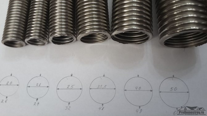 Des produits de différents diamètres sont fabriqués, y compris des tuyaux d'une section d'un mètre. Ces produits sont utilisés pour transporter divers liquides en production. Des modèles d'autres tailles peuvent également être fabriqués sur commande, mais le prix d'un tuyau en acier inoxydable ondulé fabriqué de cette manière sera beaucoup plus élevé.