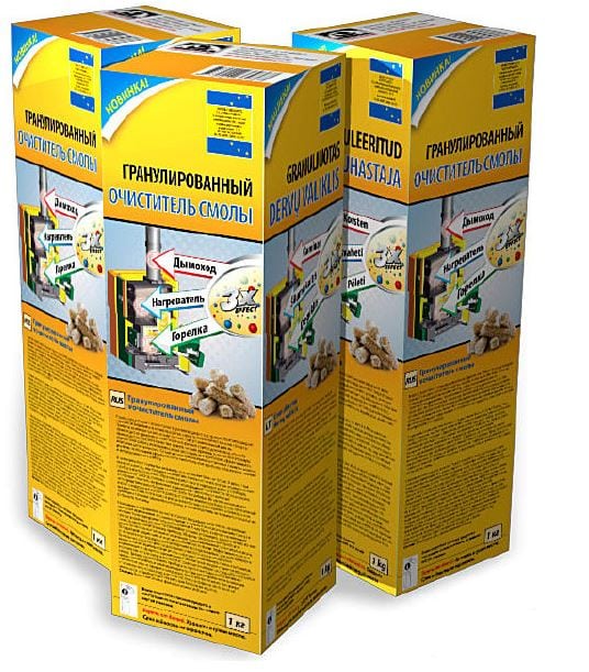 - Le produit est versé directement sur le combustible en combustion (de telles substances contiennent un ensemble de cristaux qui réagissent avec la suie et le goudron, les écrasent, puis s'éteignent avec la fumée).
