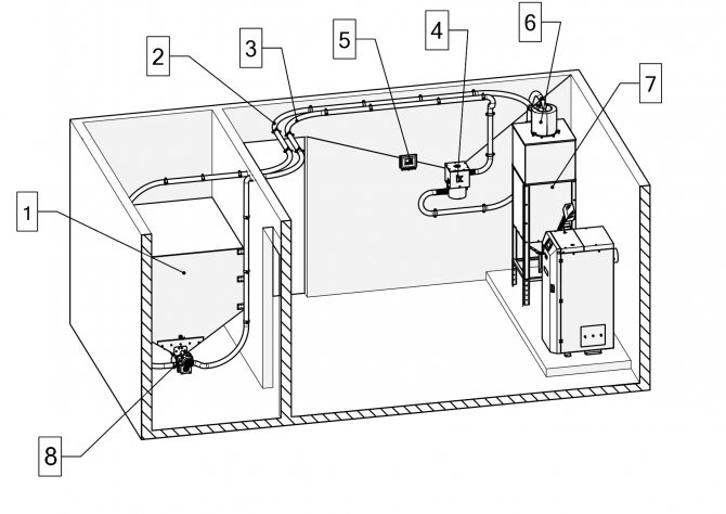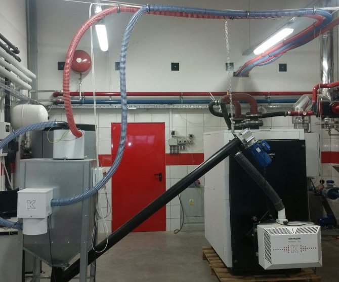 Il existe une autre façon de fournir des pellets - en utilisant un compresseur. Dans ce cas, la longueur de la "conduite de carburant" est beaucoup plus longue - 80 mètres, mais l'équipement devra être puissant et fiable, ce qui signifie qu'il est coûteux.