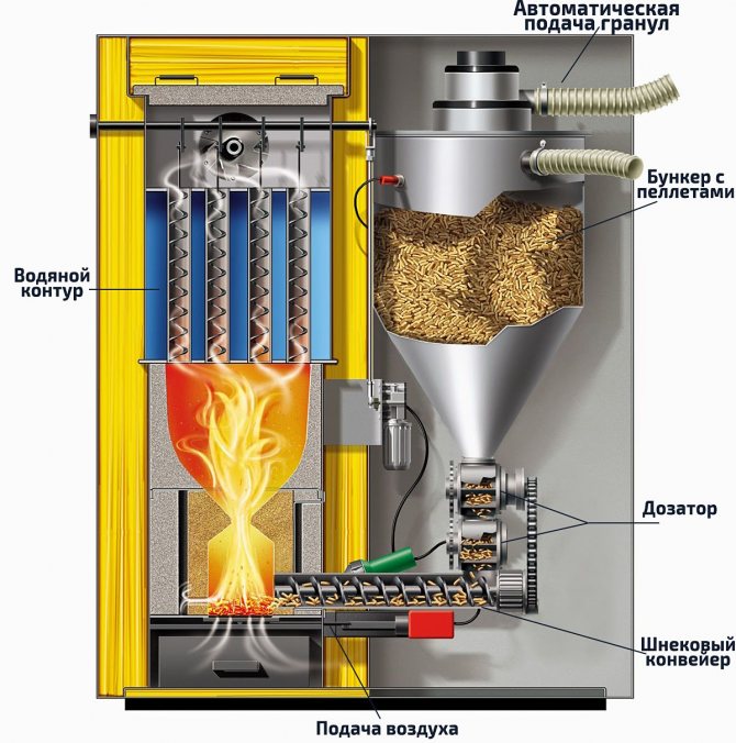 Le principe de fonctionnement d'une chaudière à granulés consiste en l'interaction séquentielle de 3 systèmes distincts (bacs de stockage, un mécanisme de transport des granulés vers la chambre de combustion et le brûleur lui-même), combinés en un seul appareil par l'attachement ABU - une unité de commande matérielle .