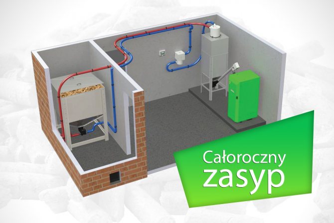 L'organisation du système d'alimentation automatique en granulés dépend directement de nombreux facteurs (caractéristiques de conception du modèle de générateur de chaleur, disponibilité d'espace libre dans la pièce, capacités financières, ainsi que d'autres préférences personnelles) et peut être réalisée de plusieurs manières :