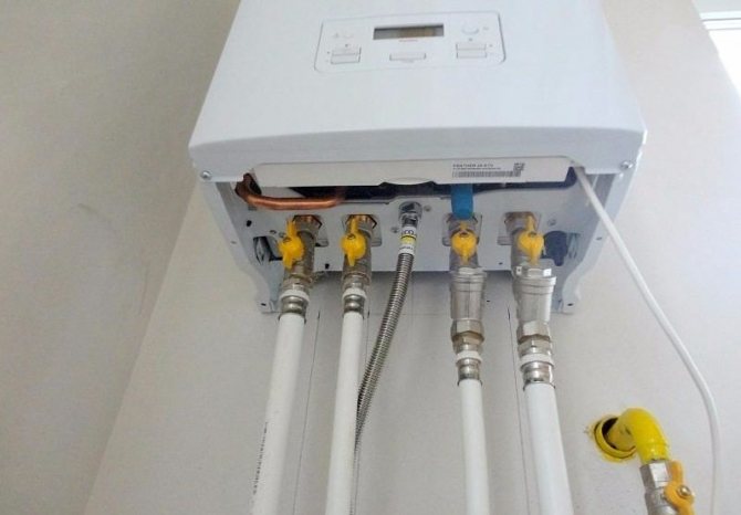 En outre, à travers la zone d'installation du capteur de débit d'eau et à travers le dispositif anti-calcaire magnétique, l'eau pénètre dans le canal interne de l'échangeur de chaleur coaxial en cuivre. En raison de l'extraction de la chaleur des parois de l'échangeur de chaleur, chauffée par le liquide de refroidissement passant à l'intérieur du circuit de chauffage, l'eau froide est chauffée.