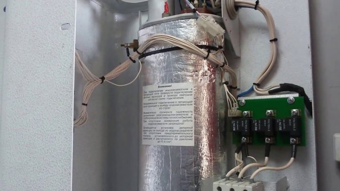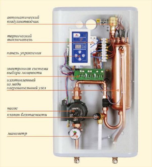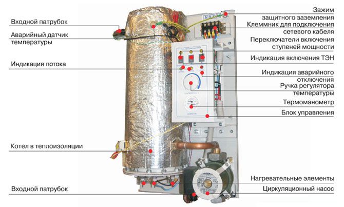 La particularité de la chaudière électrique est un échangeur de chaleur avec un élément chauffant pour chauffer l'eau. Une pompe est utilisée pour organiser la circulation forcée. Il y a une entrée pour un froid, une sortie pour un liquide de refroidissement chaud.