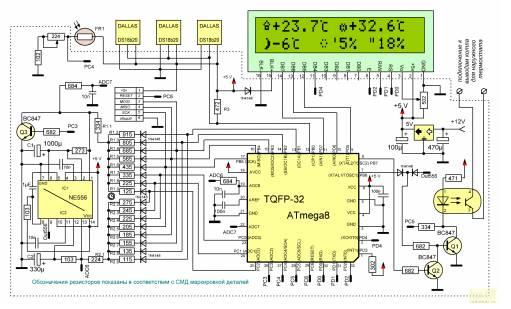 Vous trouverez ci-dessous un schéma d'un thermostat de chaudière fait maison, qui est assemblé sur des microcircuits des séries Atmega-8 et 566, un écran LCD, une cellule photoélectrique et plusieurs capteurs de température. Microcircuit programmable Atmega-8 et est responsable du respect des paramètres spécifiés des réglages du thermostat.