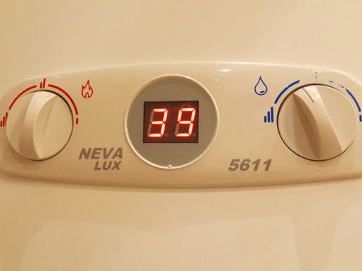 Lorsque l'interrupteur à bascule de la commande de jet est réglé sur la position minimum et le régulateur de gaz sur le maximum, l'échangeur de chaleur surchauffera, la colonne s'éteindra lorsque le capteur de surchauffe se déclenchera. Pour rallumer l'appareil, vous devez fermer le robinet d'eau chaude, puis le rouvrir. Réduisez la consommation de gaz ou augmentez la consommation d'eau à l'aide d'interrupteurs à bascule. La surchauffe de l'échangeur de chaleur entraîne la formation de tartre, du bruit pendant le fonctionnement. Cela réduit la productivité de l'appareil, réduit le débit de sortie, il n'est donc pas recommandé de diluer le flux chaud avec un flux froid, car la durée de vie de l'appareil diminue. D'après l'expérience utilisateur, la température ne doit pas être réglée à plus de 60 degrés.