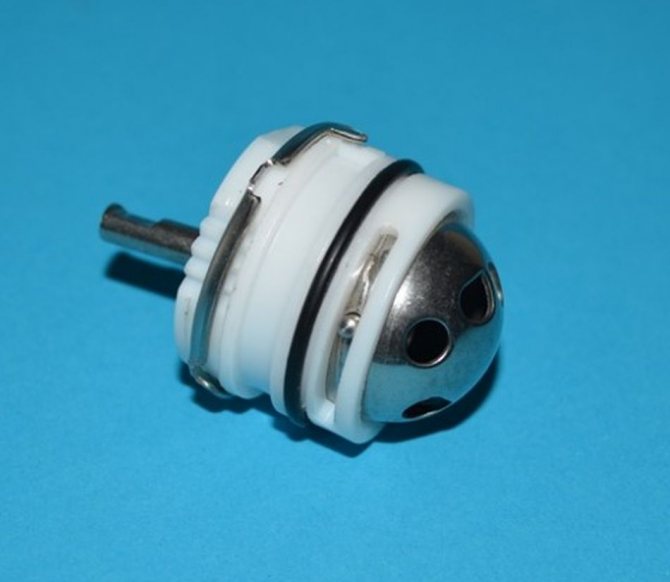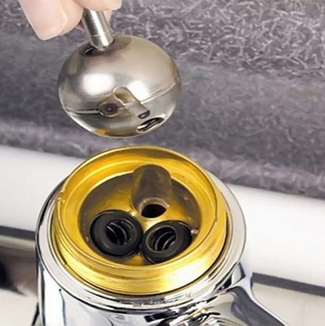 La cavité interne de la bille (chambre de mélange) est remplie d'eau froide et chaude à travers les trous latéraux, où le mélange a lieu. Le trou central sert à évacuer le liquide déjà mélangé dans le canal de sortie, par lequel il entre dans la tête du mélangeur dans un état prêt à l'emploi.