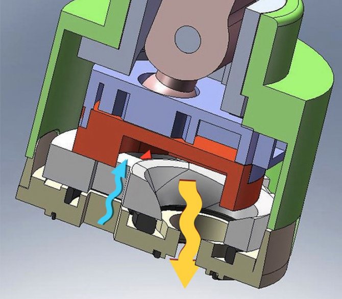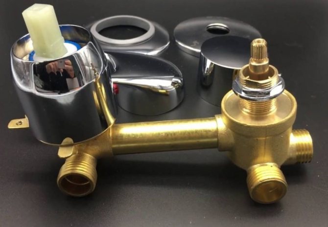 Le disque inférieur a des trous qui correspondent à ceux du boîtier. Le disque supérieur, se déplaçant au moyen d'un levier, réduit le jeu de chacun des canaux d'entrée (jusqu'à un chevauchement complet), régulant ainsi la quantité d'eau entrante. Pour un mouvement fluide des plaques, l'espace entre elles est rempli de graisse silicone.