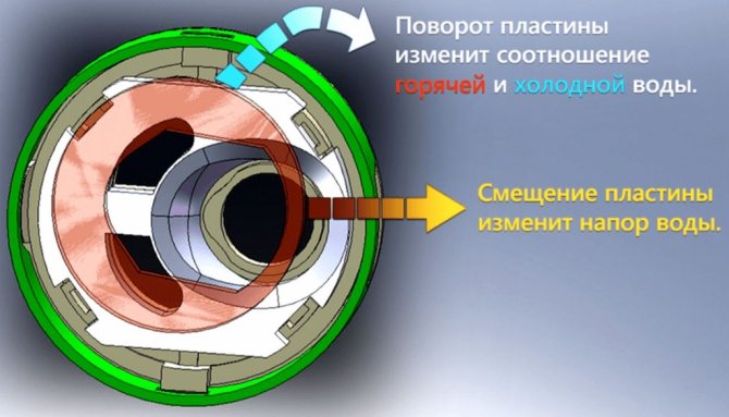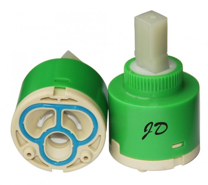 La cartouche en forme de disque a une forme cylindrique avec trois trous sur le fond (2 entrées et une sortie). À l'intérieur du cylindre, il y a deux disques en céramique en contact étroit l'un avec l'autre. L'un d'eux est immobile et se trouve en dessous. Le disque supérieur est entraîné par une tige reliée à la poignée de réglage du mélangeur.