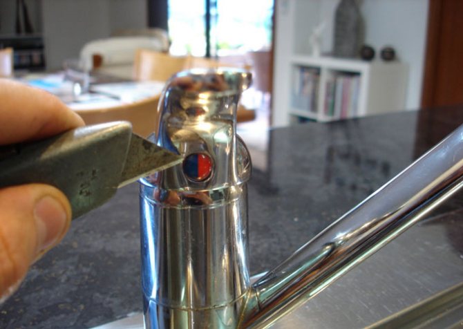 - Utilisez un couteau fin ou un tournevis fin pour retirer le bouchon du levier du mélangeur. Il est facile de le trouver: cette prise a généralement un autocollant bleu et rouge dessus. La fonction de l'autocollant est d'indiquer à l'utilisateur la position correcte du levier pour la distribution d'eau froide ou chaude. Cette procédure doit être effectuée avec soin afin de ne pas endommager le revêtement.