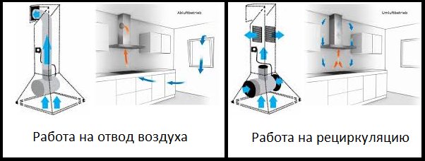 Avec toute la variété des conceptions, le principe de fonctionnement des hottes est réduit à deux options : pour l'extraction d'air et pour la recirculation.
