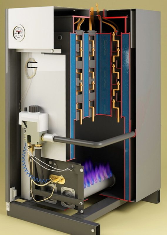 Il diffère peu du principe de fonctionnement des unités à gaz standard: le mélange gaz-air provenant des brûleurs s'enflamme dans la chambre de combustion, et déjà de la chaleur du combustible en combustion, le fluide de travail (eau) est chauffé dans un bloc spécial ( échangeur de chaleur). L'eau chaude entre périodiquement dans la conduite de chauffage et vient à la place de l'eau froide. L'excès de liquide de refroidissement généré pendant le fonctionnement est évacué dans le vase d'expansion.