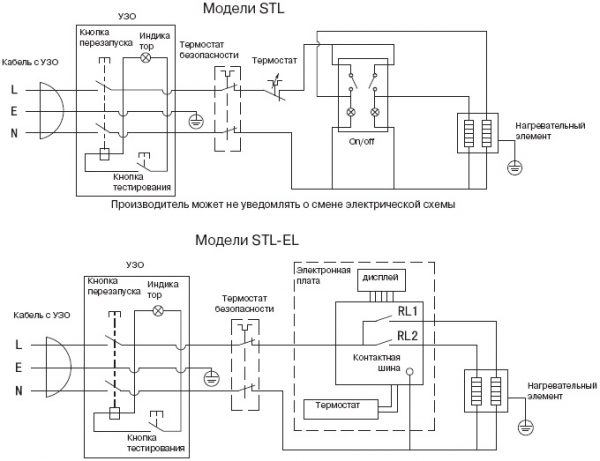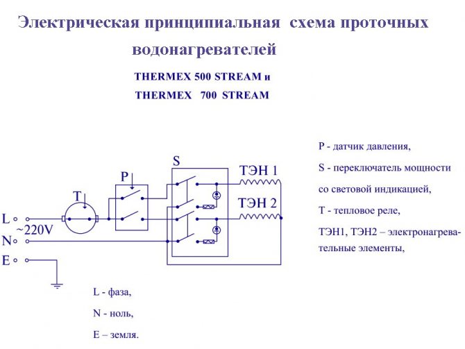 Ci-dessus se trouvent les schémas d'appareils de différents modèles de chauffe-eau instantanés. Comme vous pouvez le voir, dans ces chauffe-eau, des éléments chauffants sont fournis, auxquels le courant électrique passe à travers un relais de contrôle de la température, un pressostat et un interrupteur. Les deux relais du circuit ont une fonction de protection et déclenchent le réseau si l'un des paramètres n'est pas correct. L'interrupteur est utilisé pour régler la puissance de fonctionnement de l'appareil.