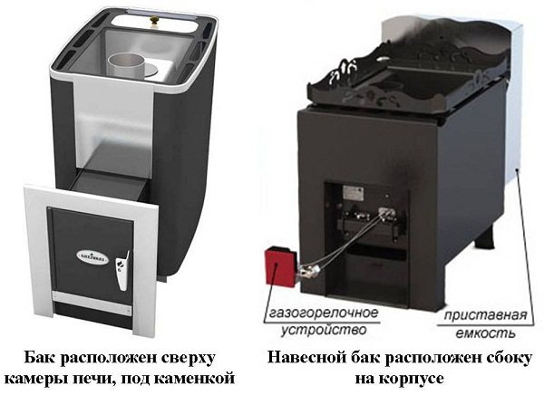 Il existe des fours à gaz avec un réservoir d'eau déjà intégré et une version à distance. La première option est plus pratique, car l'eau est chauffée par les produits de combustion du carburant. La cheminée doit être installée de manière à pouvoir traverser le volume d'eau chauffé. Le chauffage du réservoir génère également de la chaleur, qui provient du réchauffeur. Cette option vous permet de ne pas encombrer la baignoire avec des appareils inutiles.