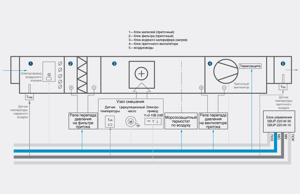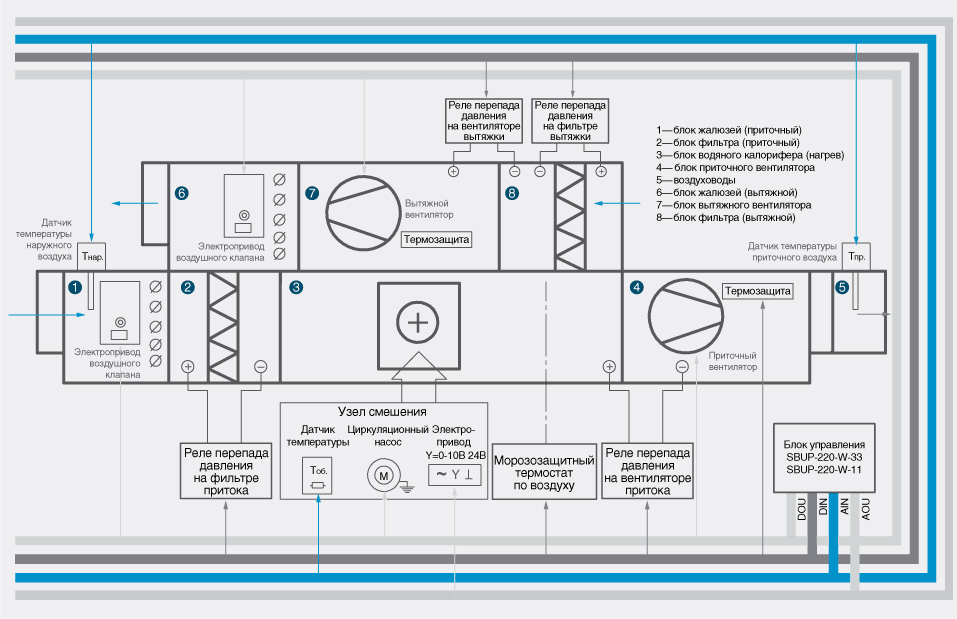 - protection automatique continue de l'échangeur de chaleur à eau contre le gel par la température de l'eau et la température de l'air d'alimentation, contrôle de la contamination du filtre à air dans le système d'alimentation ;
