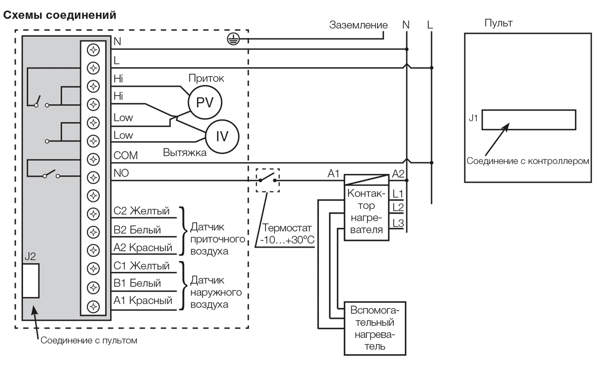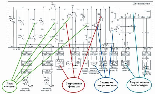 Un schéma électrique schématique de la ventilation d'urgence ou de la ventilation conventionnelle comprend une description complète des dispositifs électriques utilisés dans le système et un dessin de leur connexion à l'alimentation électrique.
