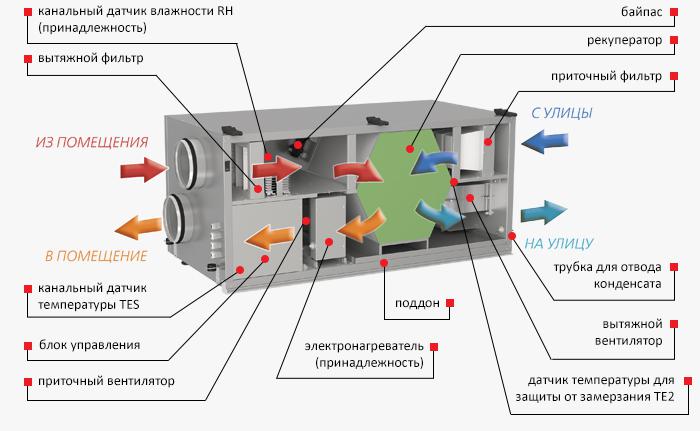À l'intérieur du boîtier se trouvent des dispositifs tels qu'une alimentation, un contrôleur et des convertisseurs. Plusieurs disjoncteurs sont responsables d'appareils individuels: réchauffeurs, récupérateurs, ventilateurs, unités de refroidissement, etc.