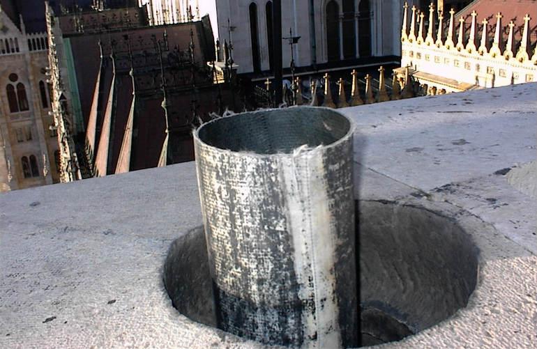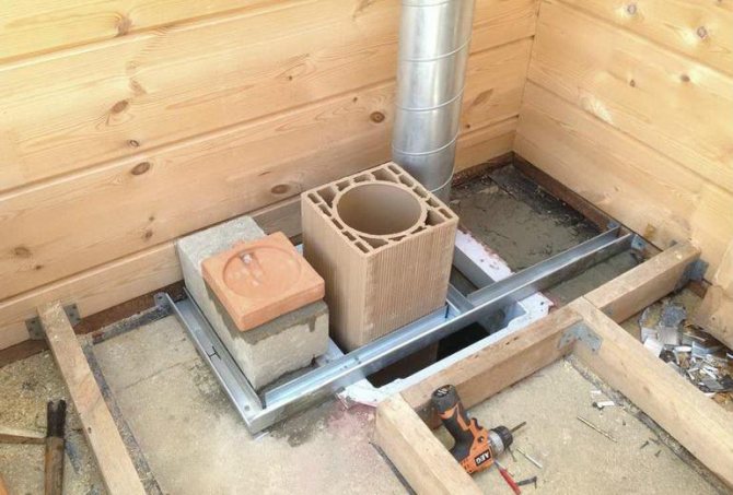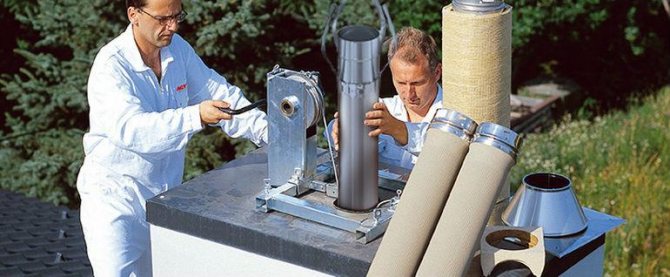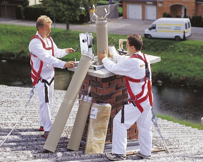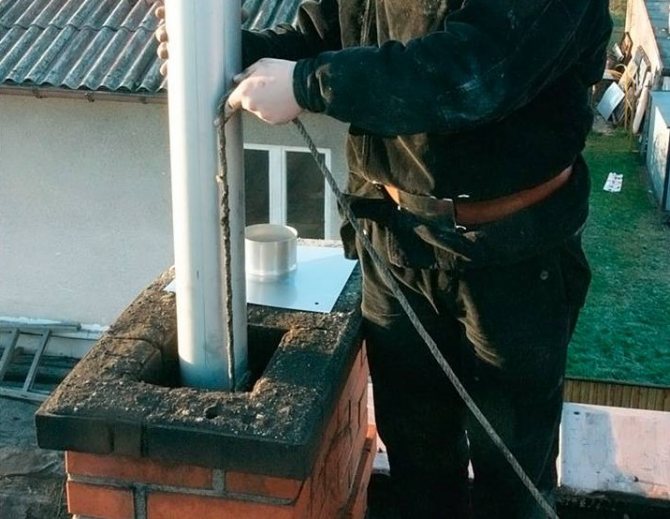 - un collecteur de condensat - un élément de support d'un manchon en céramique - est équipé d'un mécanisme à rouleaux et abaissé à travers la cheminée sur une profondeur de 30 cm à l'aide d'un treuil, puis l'extrémité supérieure est traitée avec un produit d'étanchéité;