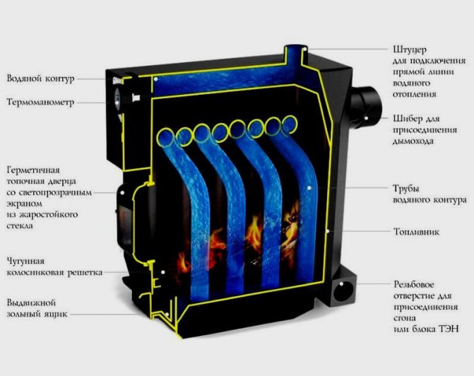 Dans la chambre de combustion, lors du processus de combustion du combustible, ses parois sont chauffées et l'eau qui se trouve autour de la chambre de combustion dans la «chemise d'eau» de la chaudière est chauffée.