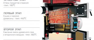 Les chaudières à pyrolyse (génératrices de gaz) sont un peu plus compliquées. Leur conception contient deux chambres de combustion... Le combustible solide (bois de chauffage) est mis dans le premier, à haute température et une carence en oxygène se produit processus de pyrolyse avec la libération de gaz de pyrolyse. Il pénètre dans la deuxième chambre, où il brûle et dégage de la chaleur pour le liquide de refroidissement. Seul le charbon de bois reste du bois de chauffage.